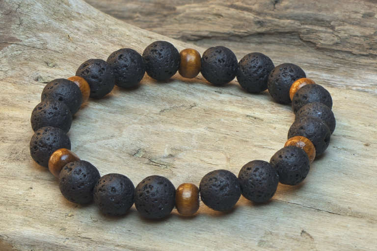 This boho style diffuser bracelet handmade in lava rock and wood is part of the Andorinart® Treasures of the Earth collection.