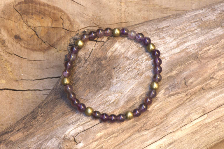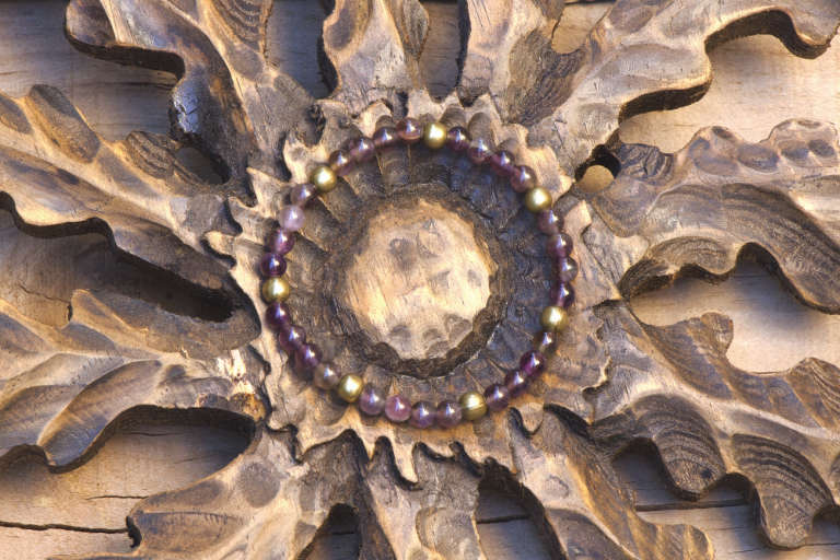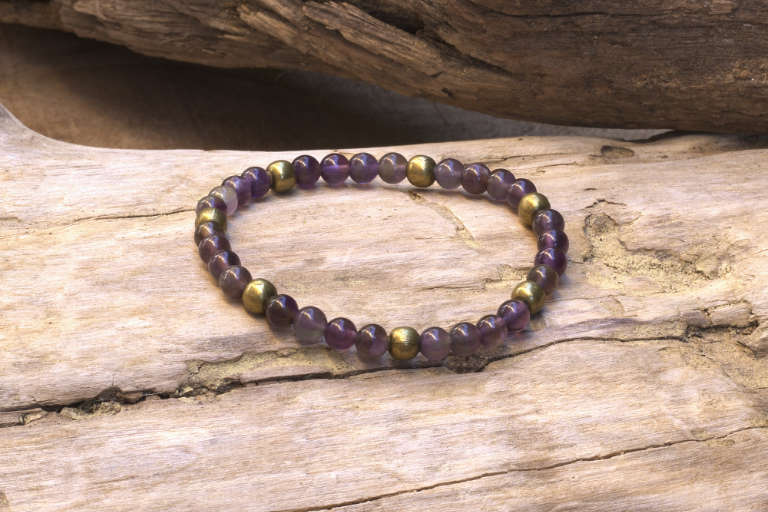 Esta pulsera de cuentas de amatista bohemia y piezas de latón en bronce antiguo forma parte de la colección “Tesoros de la Tierra” de Andorinart®.