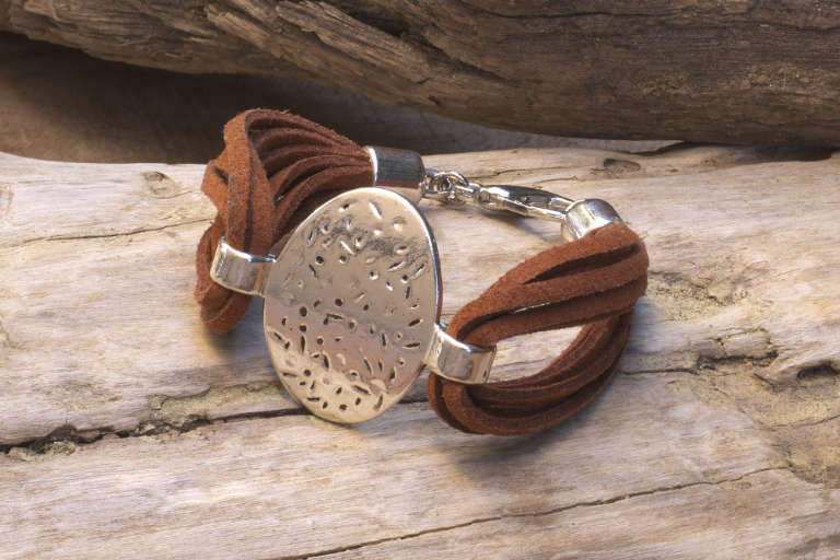 Pulsera original de estilo bohemio y diseño único inspirada en el mar y sus ciclos. Pulsera elaborada artesanalmente con piezas de ante y metal de aleación.